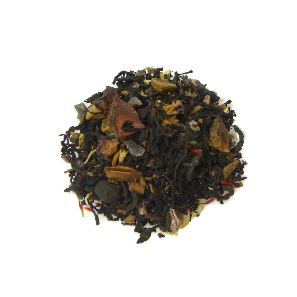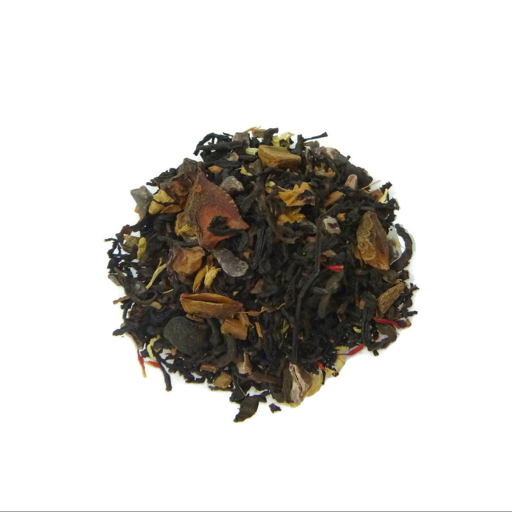 Ingredients: Black tea, pu’erh, cinnamon, star anise, cocoa beans, ginger, pistachios, safflower petals, chamomile flowers, rose petals, flavoring, natural flavors (organic compliant).