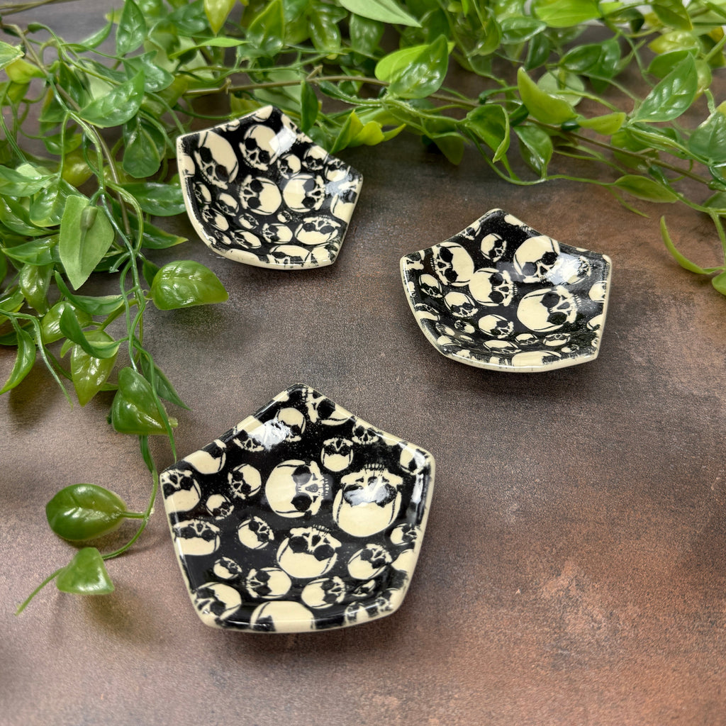 Gothy skulls peek up from these black and white 5 sided trivets. Each is the perfect thing to place infusers, tea bags or spoons onto. They measure roughly 3in x 3in.